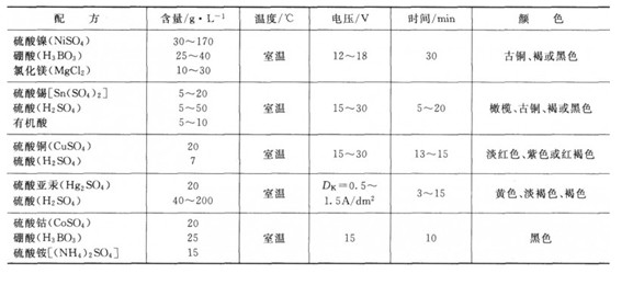 鋁及鋁合金經(jīng)過陽極氧化后,再放人含有鎳鹽、鉆鹽、錫鹽或銅鹽等溶液中進(jìn)行交流電解,使膜孔底部沉積上金屬鎳、鈷、錫或銅等而呈現(xiàn)出不同的色彩。該工藝具有工藝簡單、能耗低、著色均勻、生產(chǎn)效率高等特點(diǎn)。表7—4列舉了鋁及鋁合金的電解著色工藝。