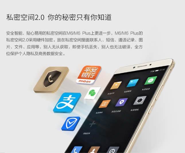 M6/M6 PLUS的私密空間2.0采用硬件加密算法,放在私密空間里的信息就算手機(jī)丟失別人也無(wú)法破譯,全方位保護(hù)個(gè)人隱私及商務(wù)數(shù)據(jù)安全。